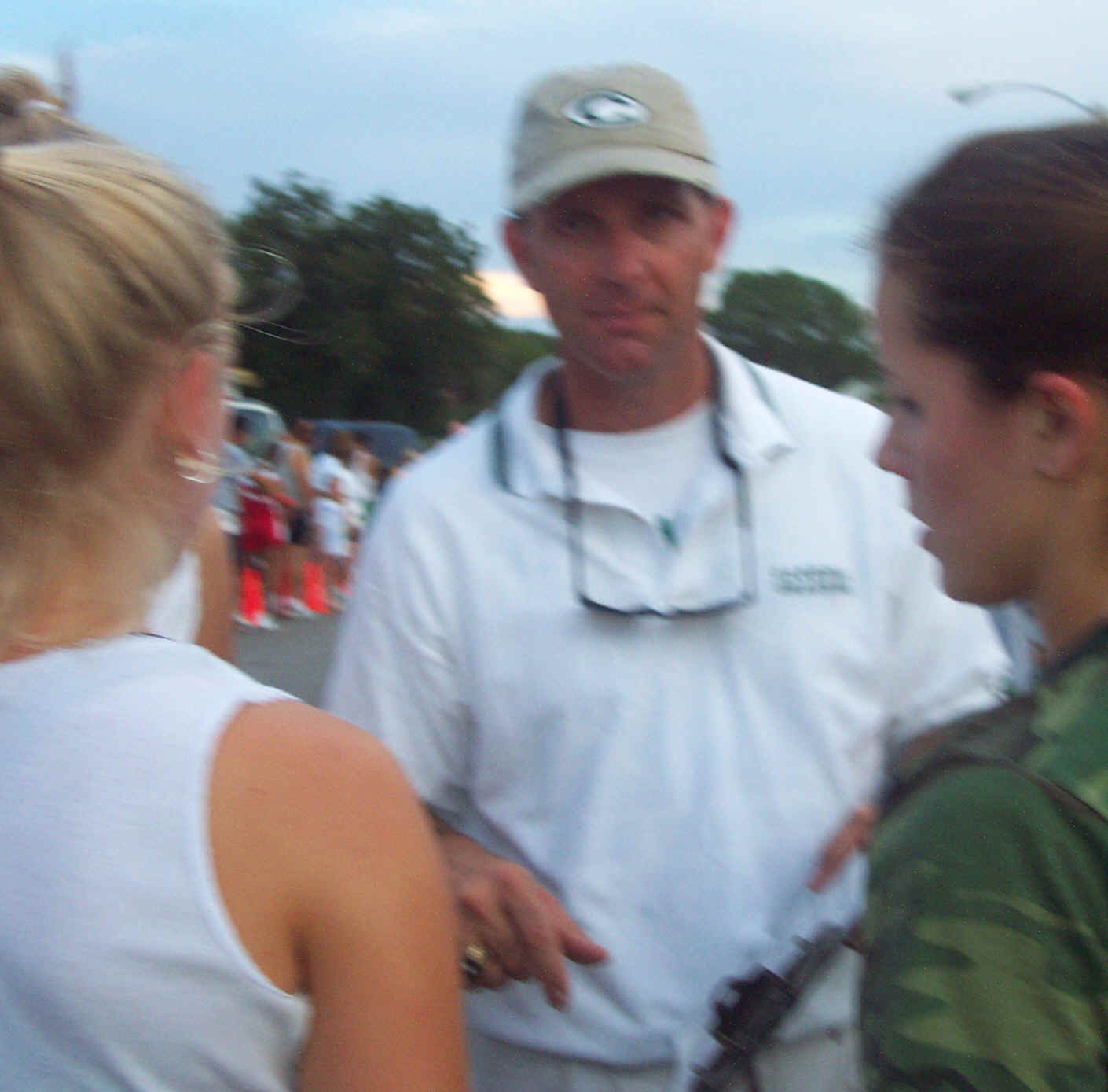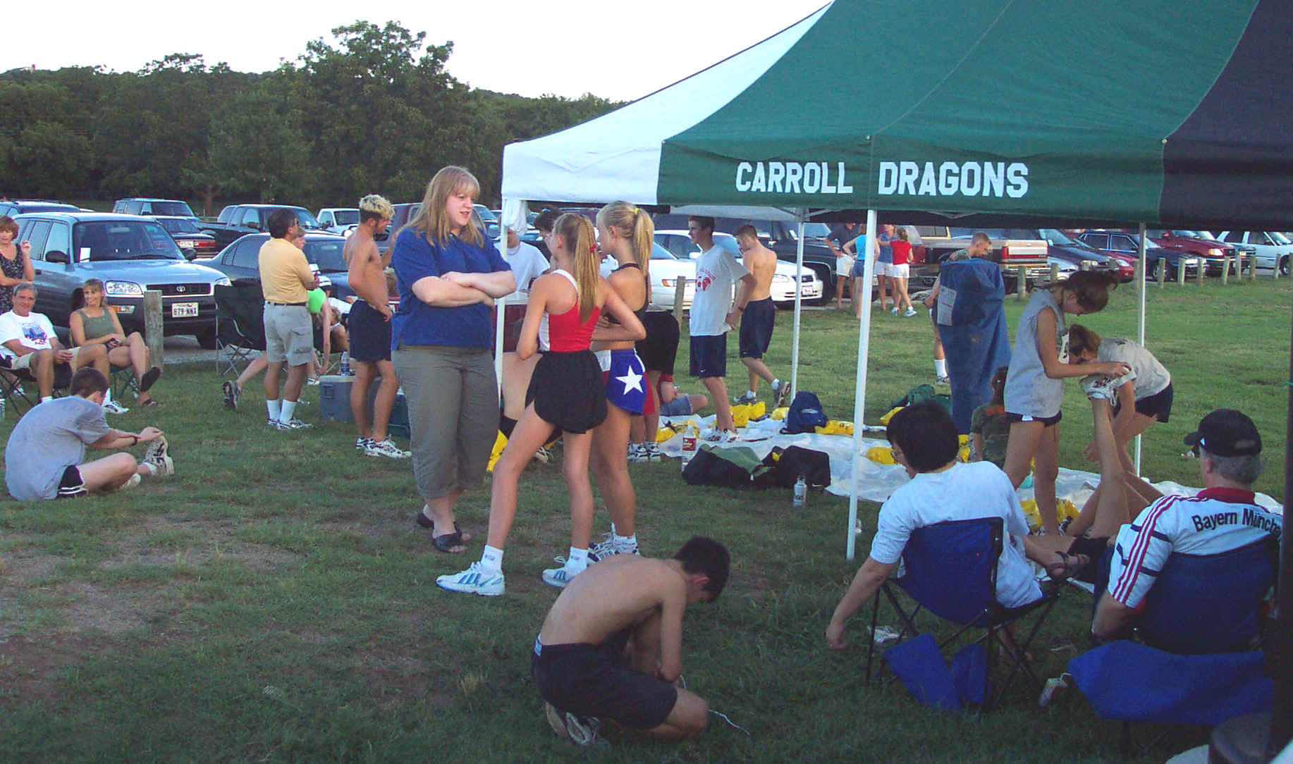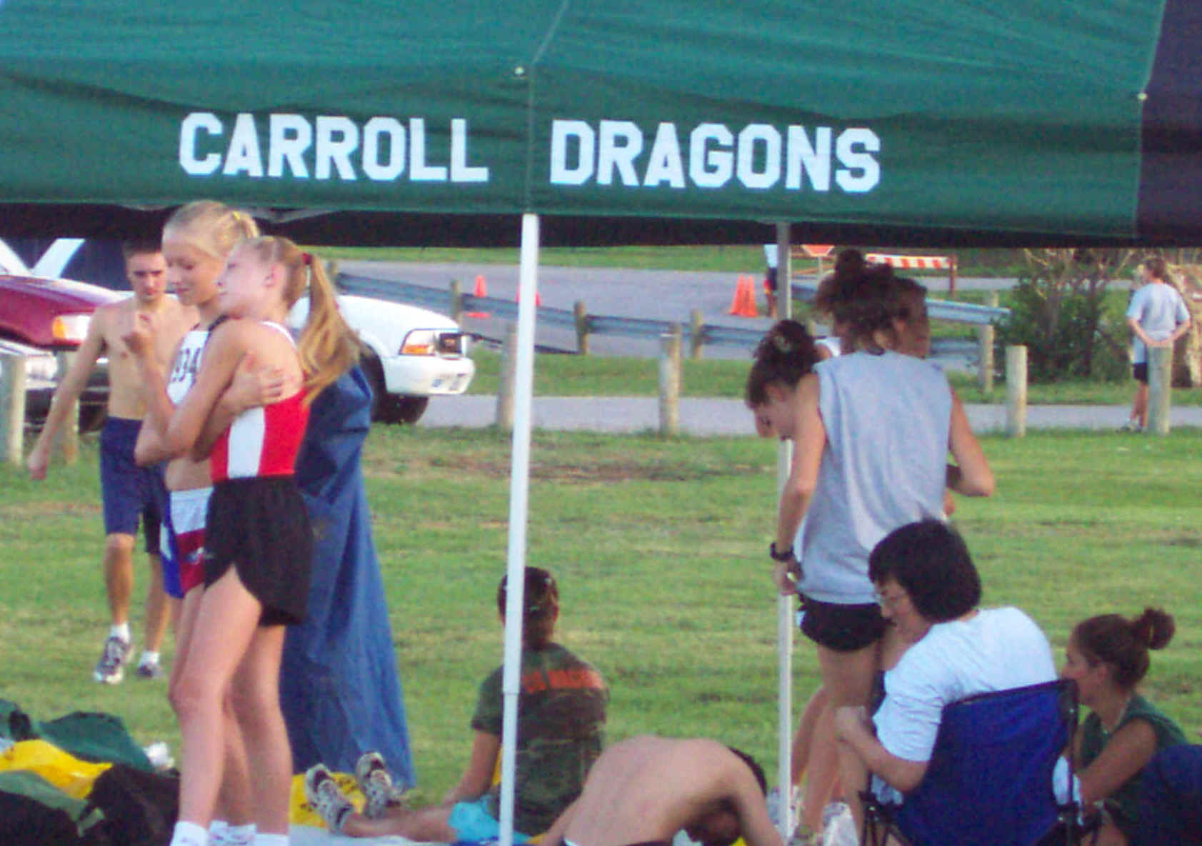 At the nice new Carroll Dragons tent....Coach O (Ondrasek) talking with Kristen Igo & Meredith Riggs