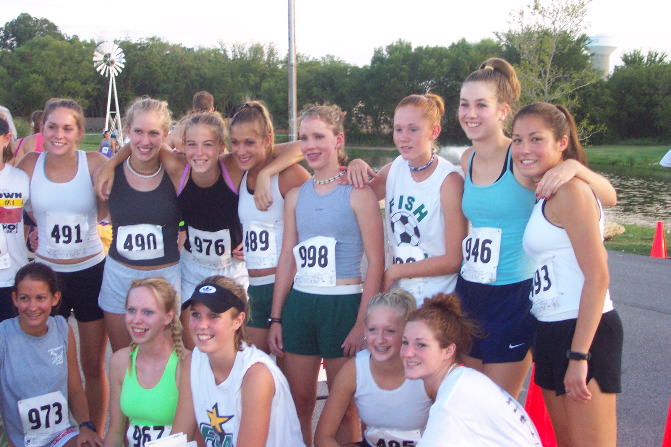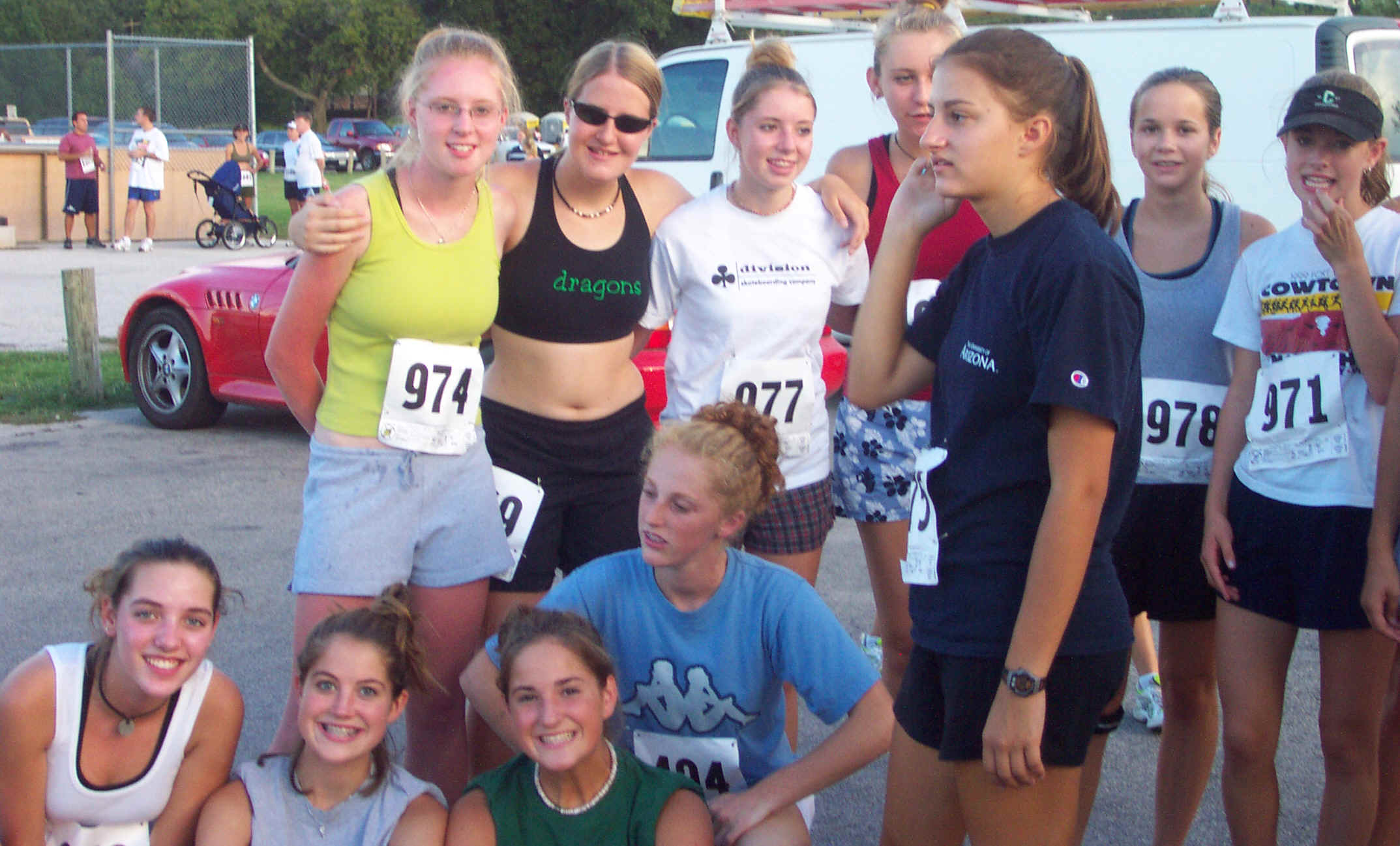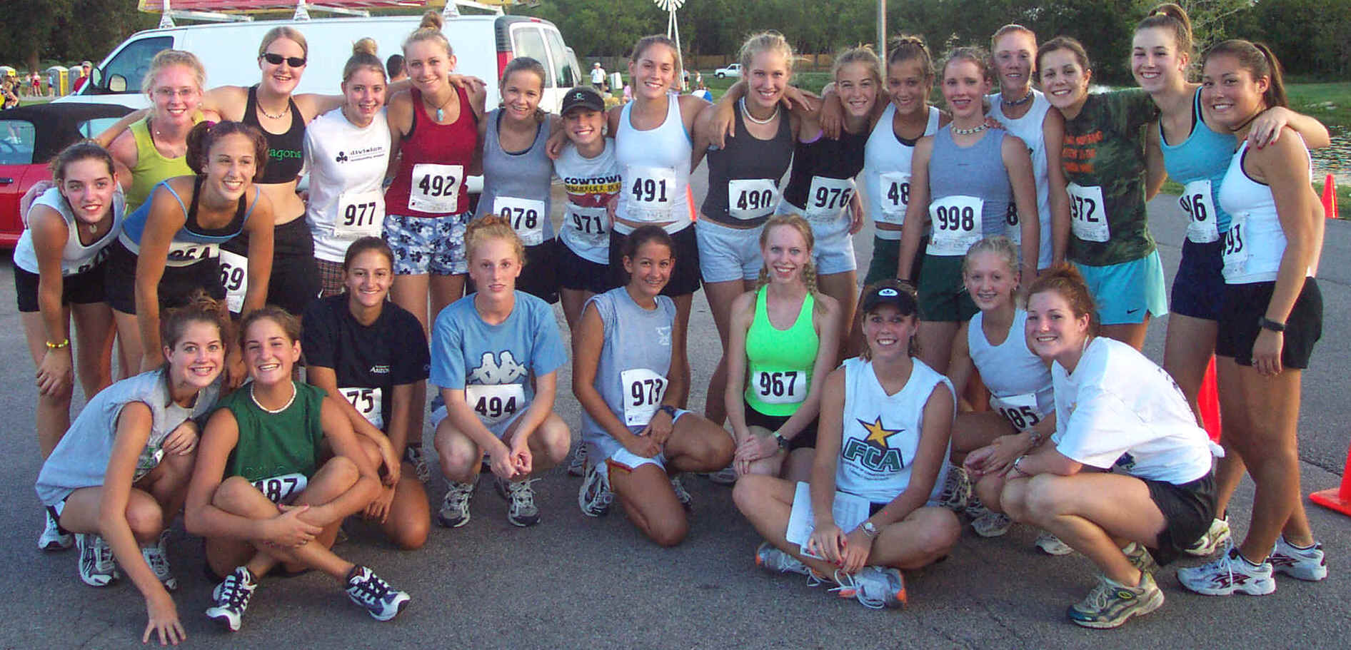 Here's the JV Girls of Carroll. From left to right, Kelsey Witty (9th grade), Kylie Giles (10th), me = Kristen (9th), Lindsey O'Connor (11th), Jill Meador (11th), Julietta (exchange student from Argentina, but equal to 12th), Shaina All (9th) and Heidi (10th). In the background you can see Lauren Helmulth, Jennifer Jost, Jessa Vacek & Lauren Swenson (all Varsity runners). This meet was in October, 2000.